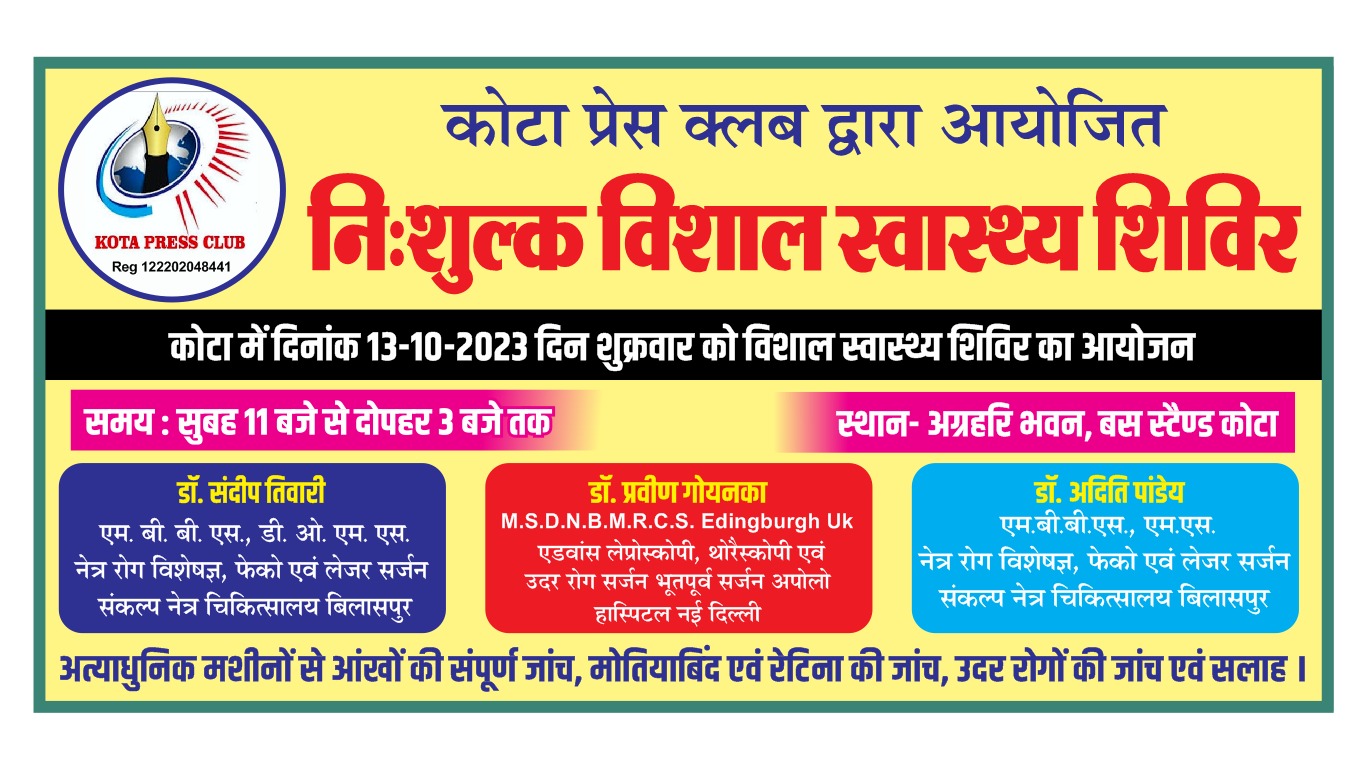 करगीरोड कोटा – कोटा प्रेस क्लब के द्वारा बुधवार तेरह तारीख को निःशुल्क स्वास्थ्य शिविर का आयोजन किया जा रहा है । कोटा प्रेस क्लब के अध्यक्ष सूरज गुप्ता ने बताया कि कोटा के अग्रहरी भवन में तेरह तारीख को स्वास्थ्य शिविर का आयोजन किया जा रहा है जिसमें बिलासपुर के संकल्प नेत्रालय के प्रसिद्ध नेत्र रोग विशेषज्ञ डा संदिप तिवारी अपनी टीम के साथ अपनी सेवाएं देंगे । इसके साथ ही बिलासपुर बालाजी हास्पीटल के उदर रोग स्पेशलिस्ट डा प्रवीण गोयनका और संकल्प नेत्रालय की ही डा अदिति पाण्डेय भी रहेंगी । इसलिए अधिक से अधिक संख्या में आकर इस कैम्प का लाभ उठावें ।